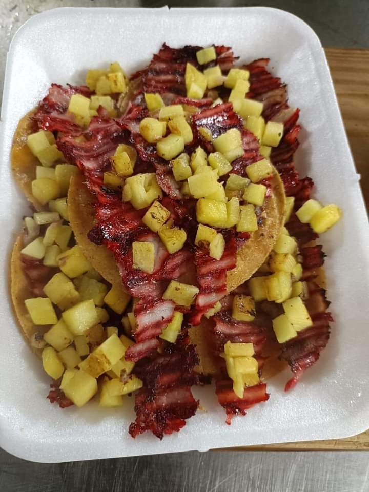 Doble tortilla de maíz, carne de puerco con piña, cebolla picada, cebolla guisada, salsa verde y roja.