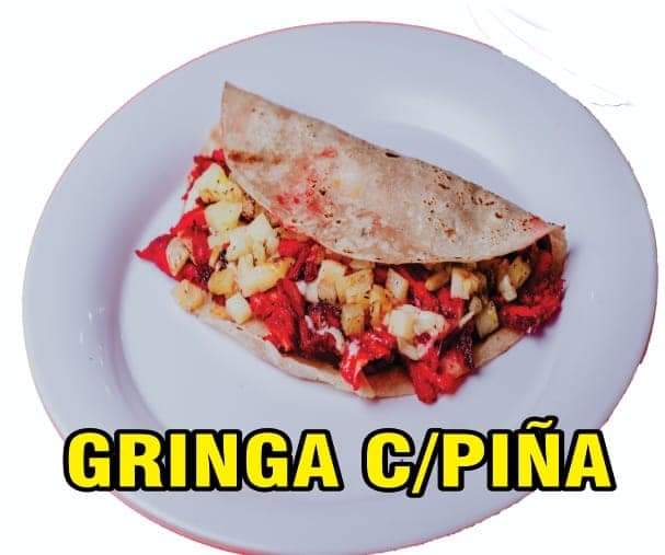 Tortilla de harina grande, carne de trompo, piña natural, queso asadero, cebolla picada, guisada, salsa verde y roja.