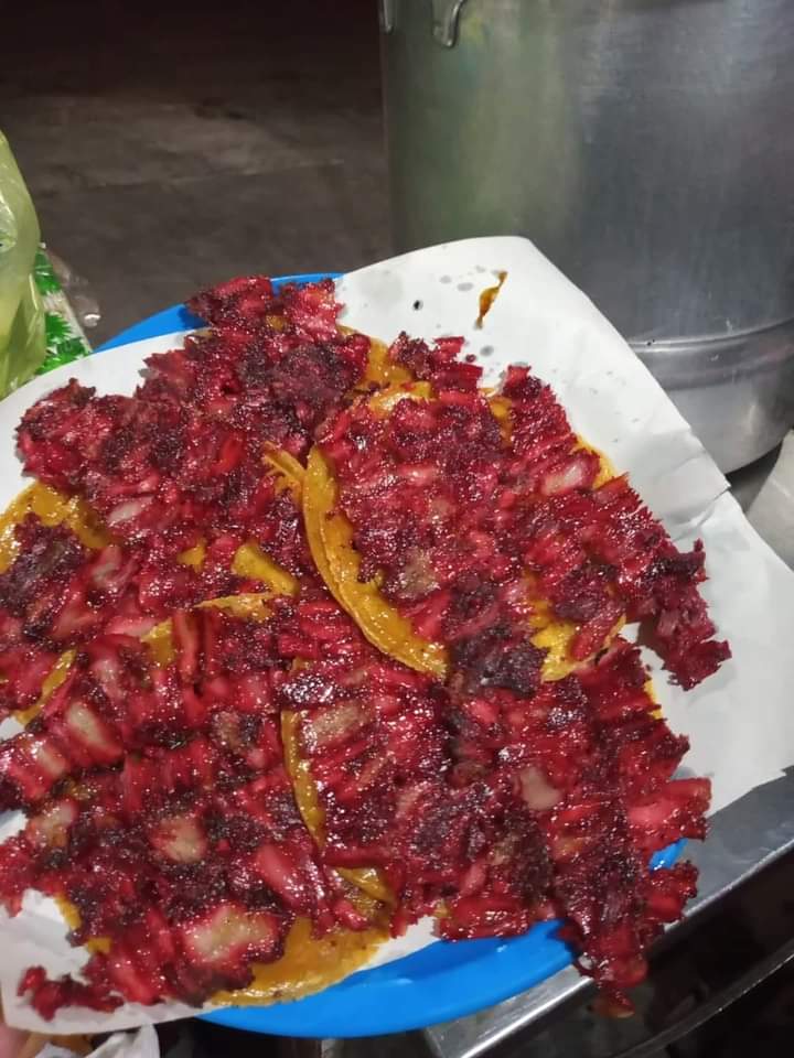 Doble tortilla de maíz, carne de puerco, cebolla picada, guisada, salsa verde y roja.