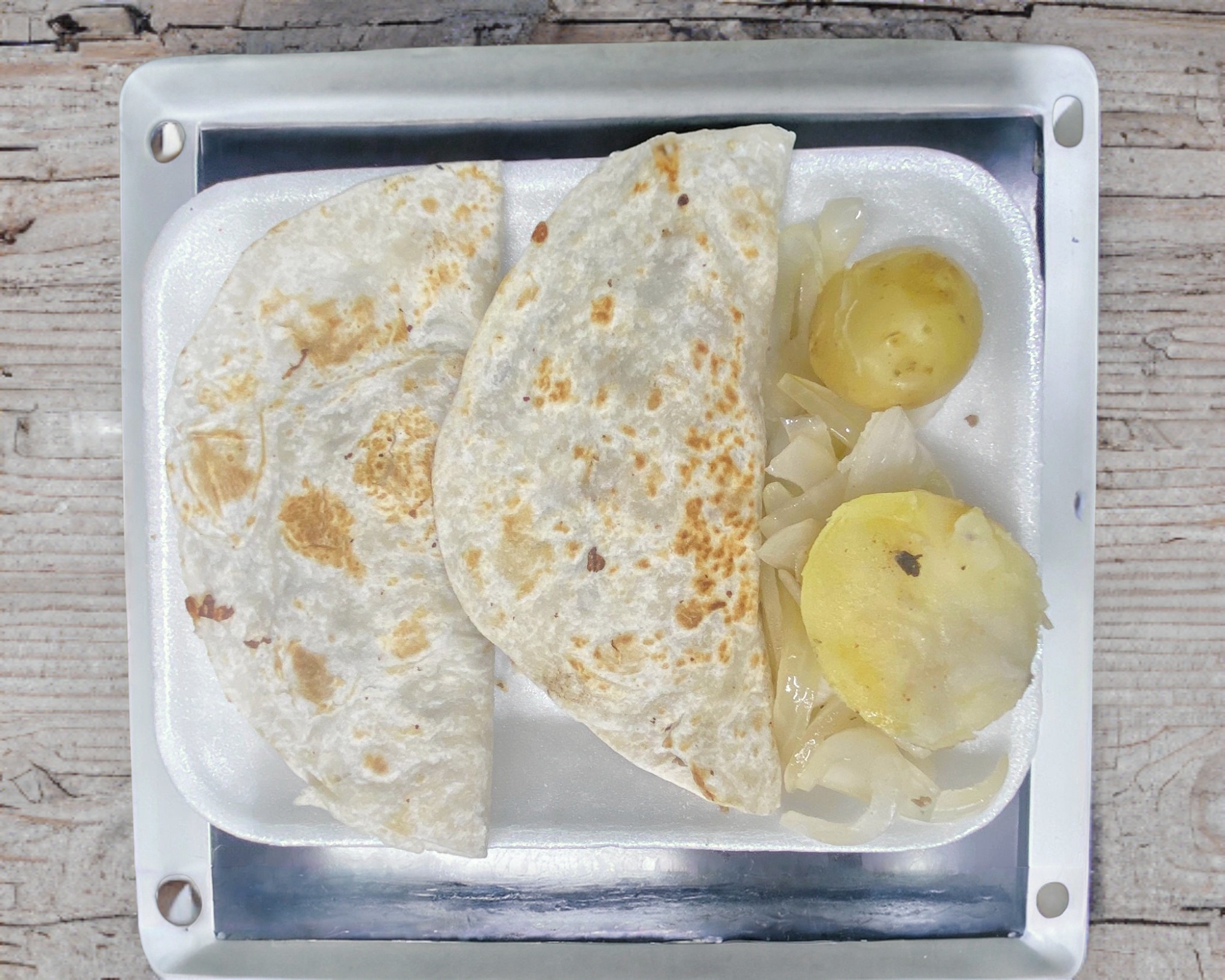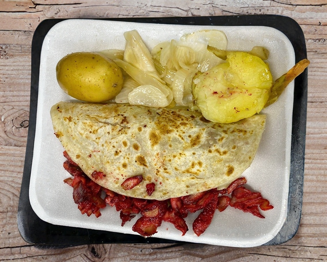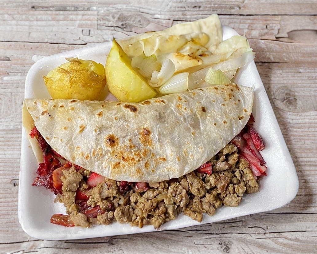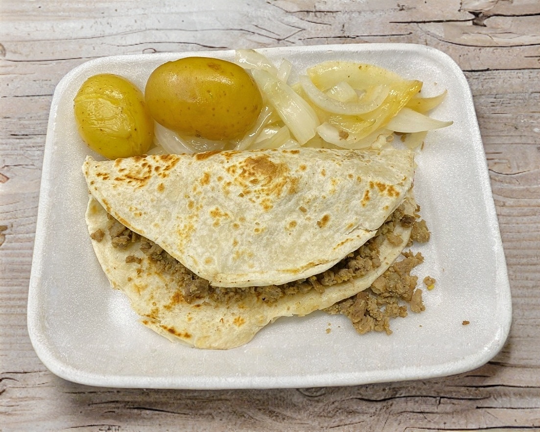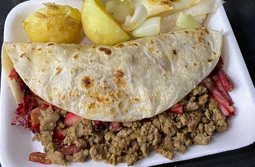 Tortilla de harina con carne y queso.