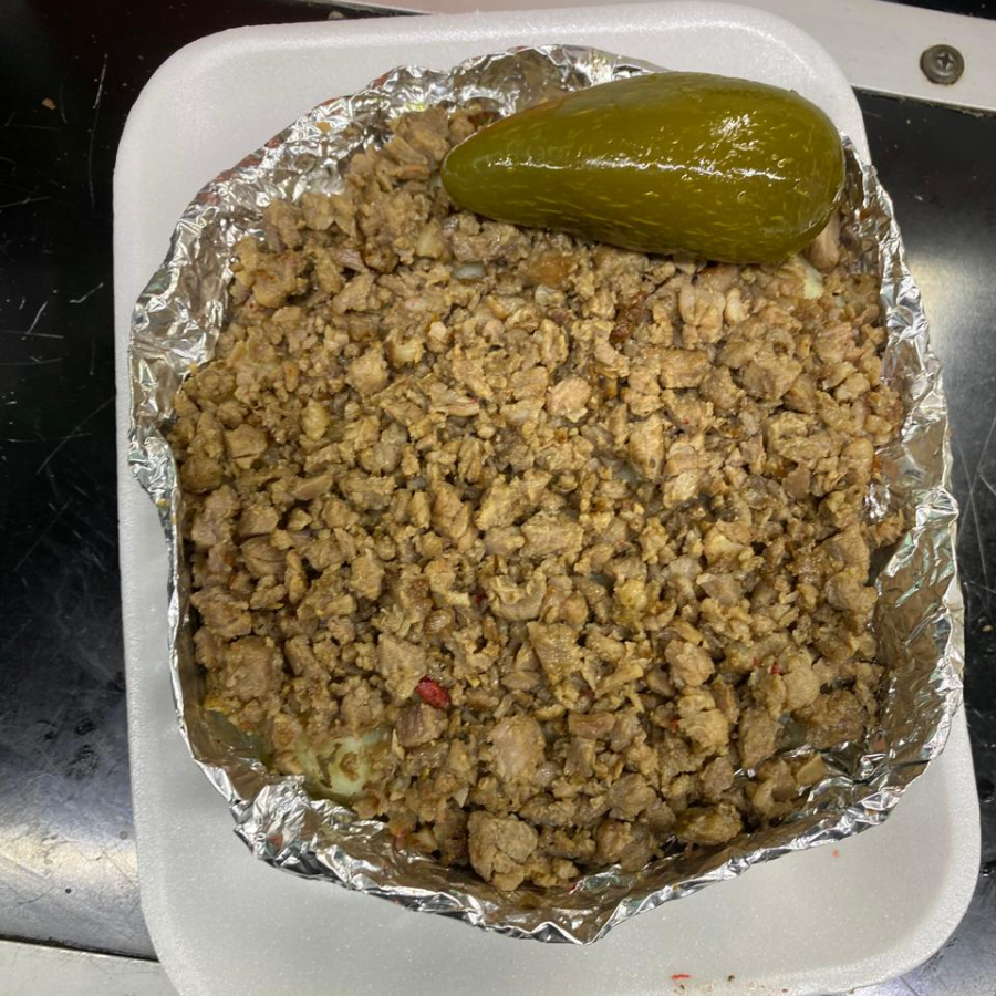 Papa rellena con combinación de carnes y quesos.