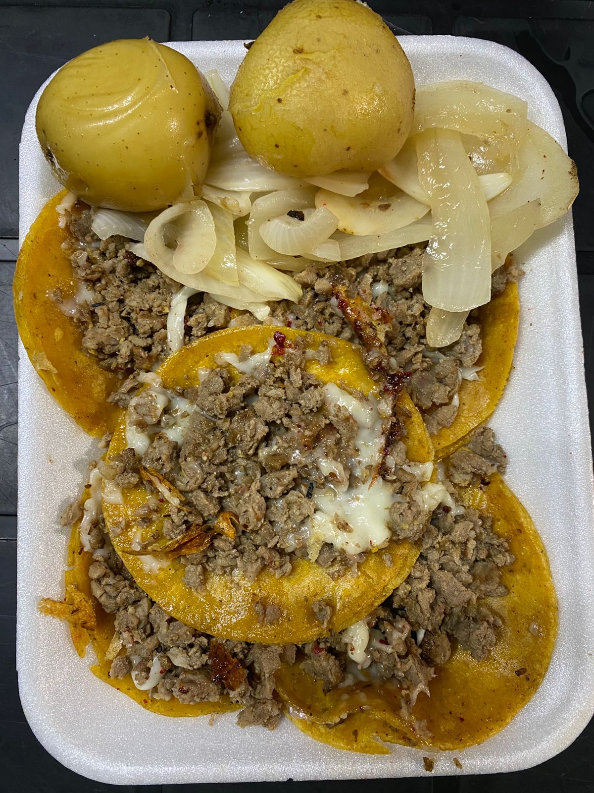 Orden de 5 tacos de bistec con queso fundido.