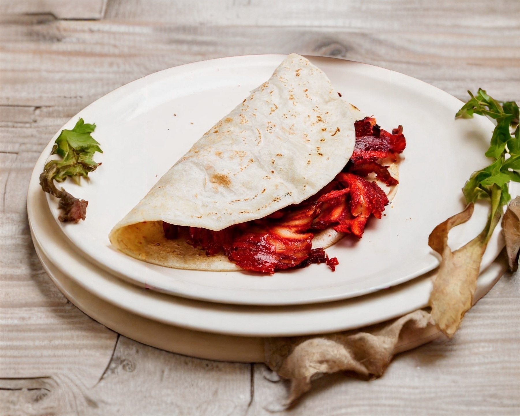 Tortilla de harina mediana queso asadero carne de trompo. Incluye salsa cebolla con cilantro y limón.