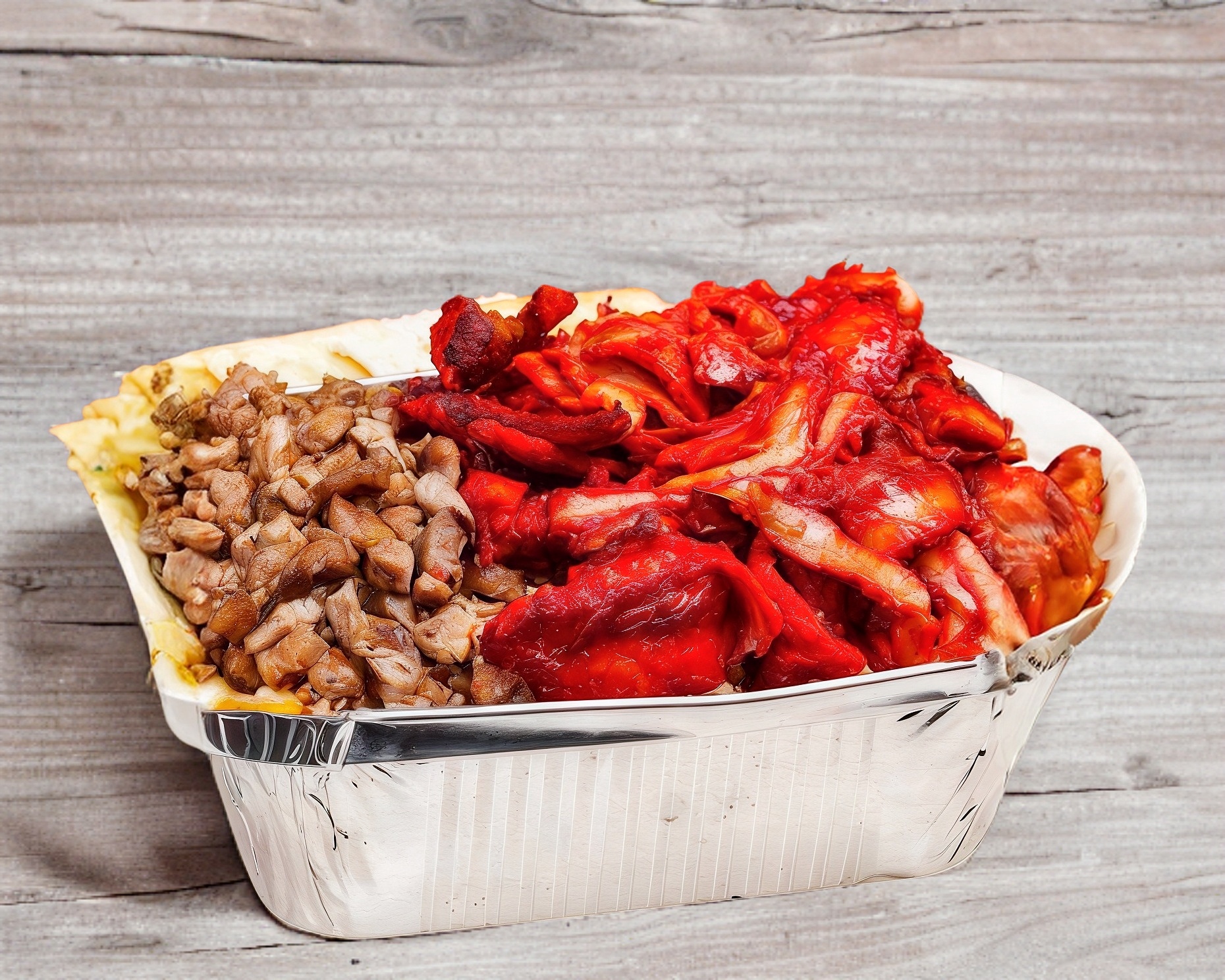 Papa asada con mantequilla, queso amarillo, queso asadero, carne asada y carne de trompo. Incluye chiles en vinagre y galletas saladitas.