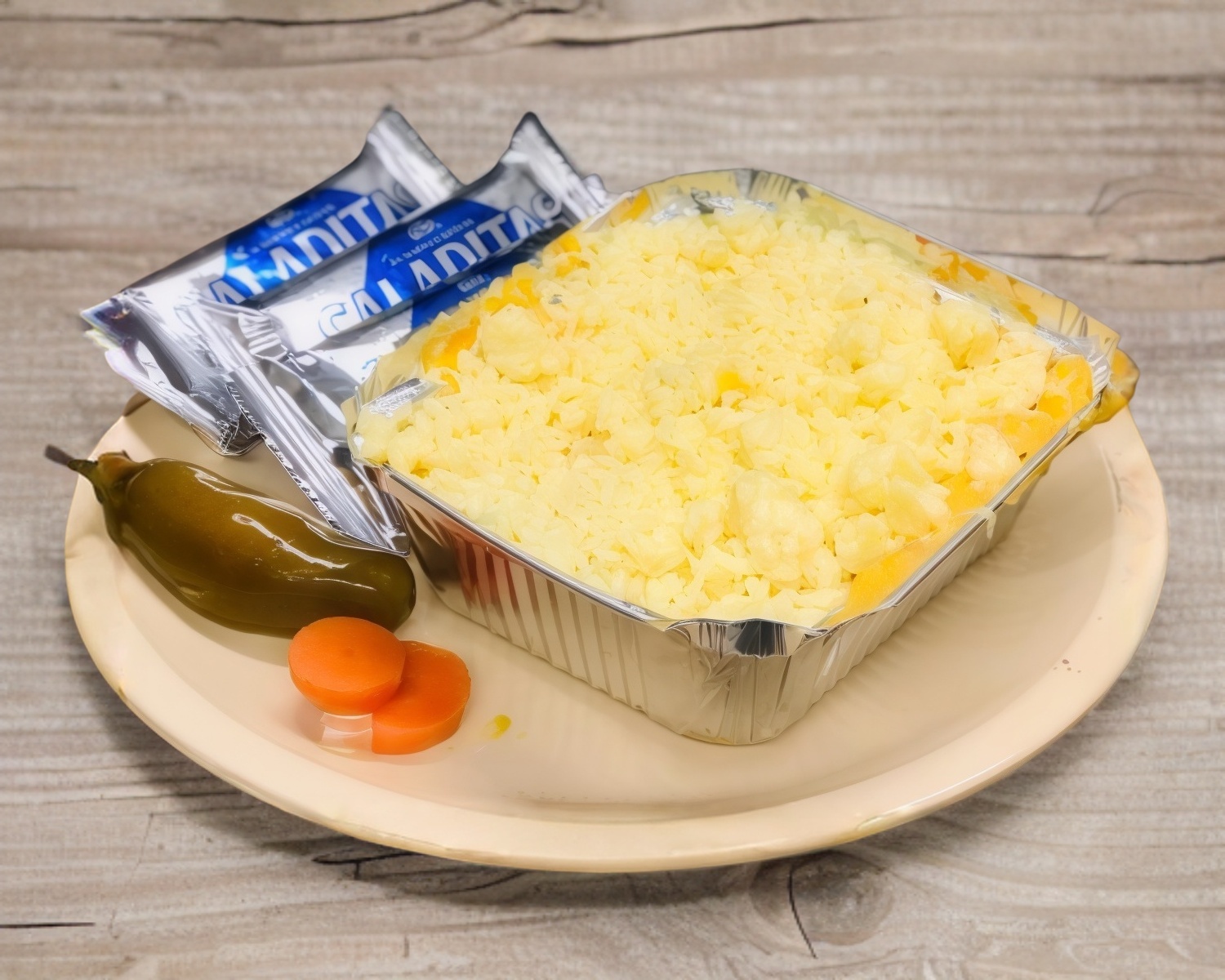 Papa asada con mantequilla, queso amarillo y queso asadero; Incluye chiles en vinagre y galletas saladitas.