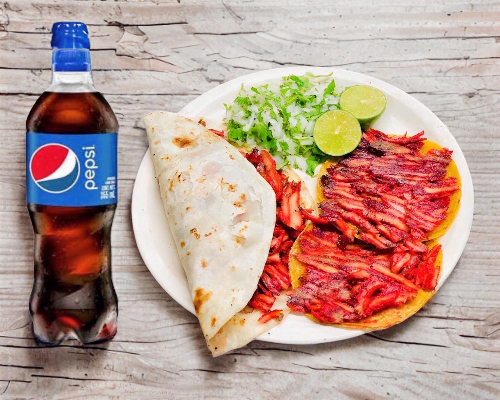 1 Gringa, 2 tacos de trompo, 1 Pepsi 355ml (botella).