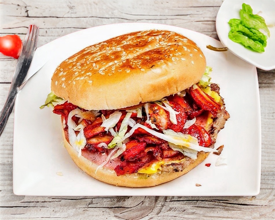 Pan, carne casera, carne de trompo, jamón, queso asadero, queso amarillo, lechuga, tomate, cebolla, aguacate, cátsup, mayonesa y mostaza.