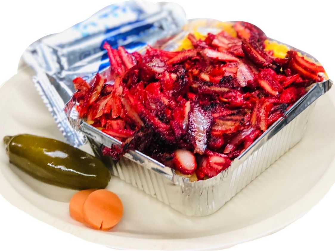 100 gr de jugosa carne con una rica porción de pastor + aguacate, mayonesa, catsup, mostaza, lechuga, tomate, cebolla, jamón, queso blanco y queso amarillo