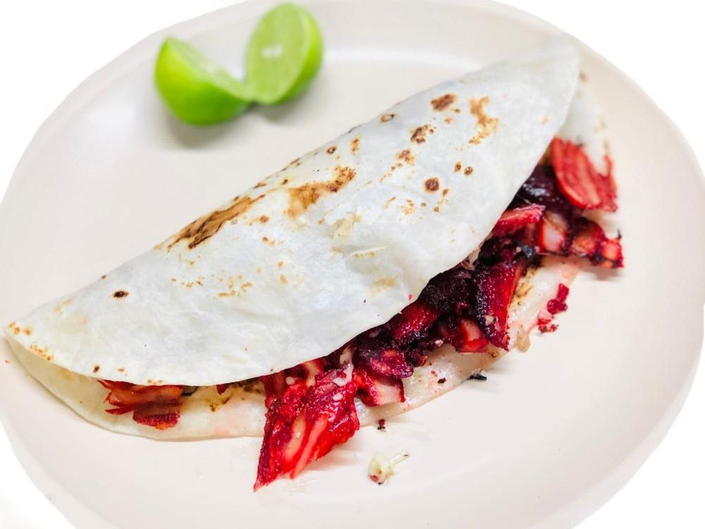 Tortilla de harina grande queso asadero, carne de trompo. Incluye salsa, cebolla y cilantro y limón.