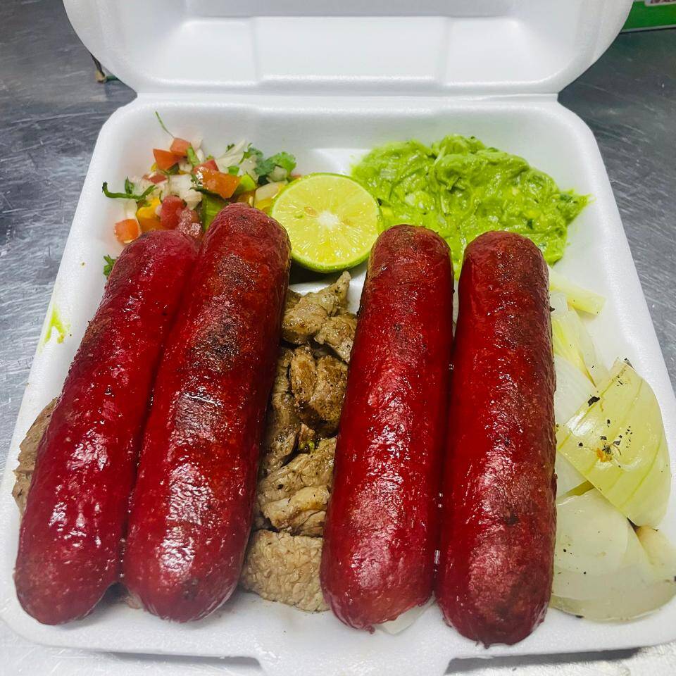 1 Salchicha asada, 3 quesadillas de maíz lechuga, tomate aguacate y carne asada, cebolla con cilantro, cebolla asada, salsas, limones, y papitas de galeana.