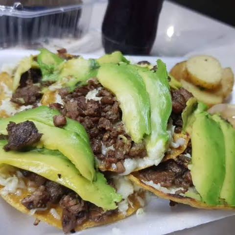 5 tostadas con queso asadero y aguacate con carne asada incluye salsas y limones