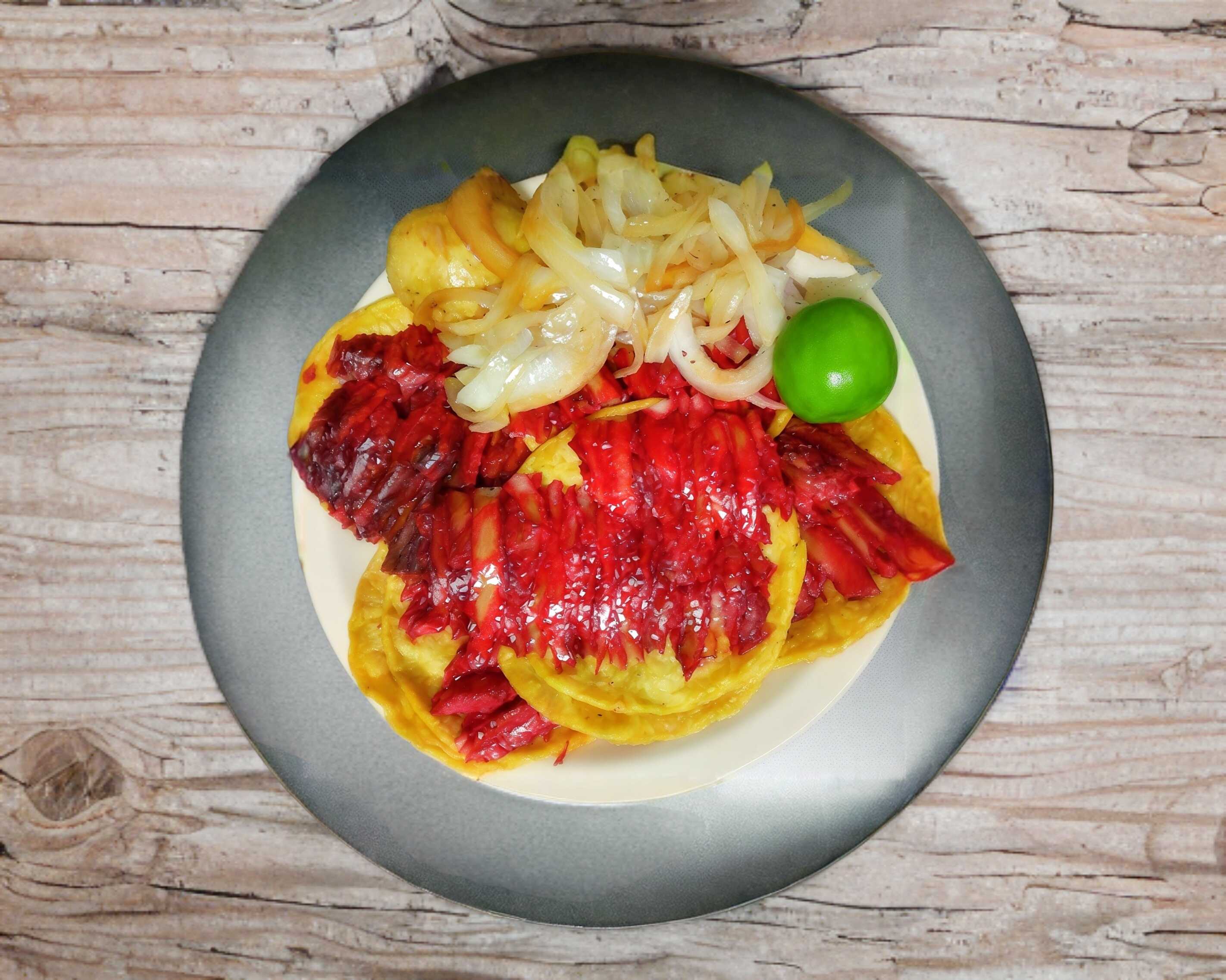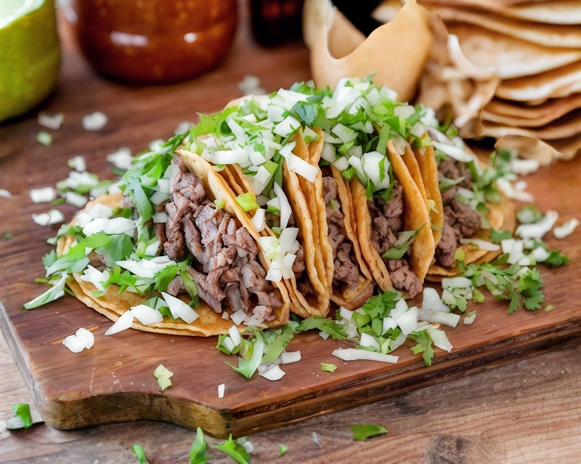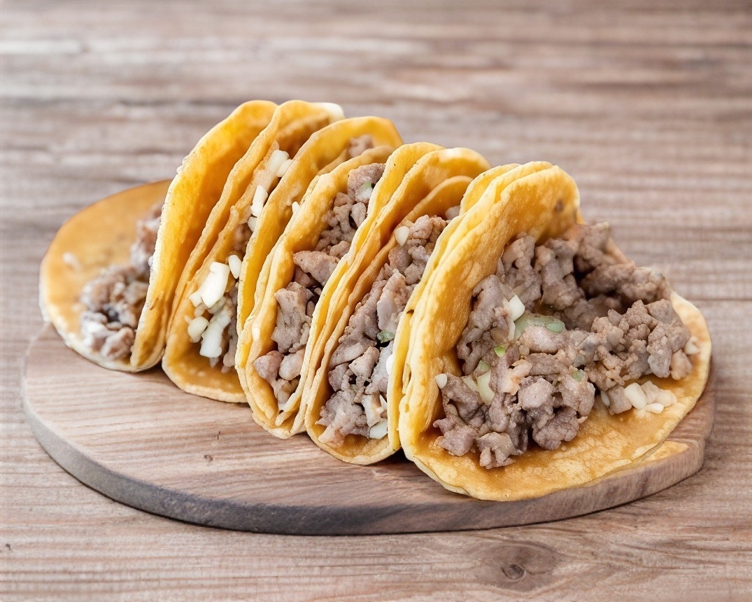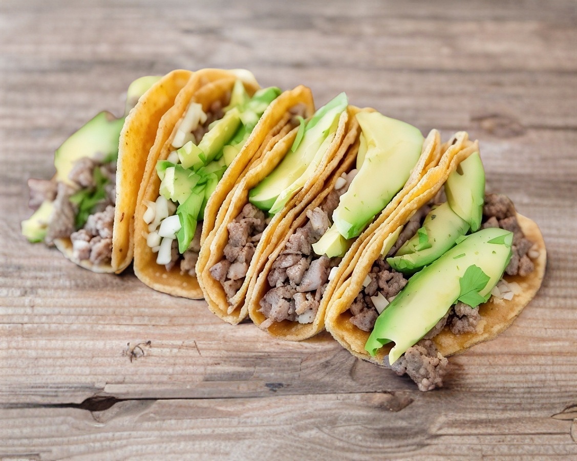 5 tacos con doble tortilla de maíz, aguacate, queso y bistec encima. (Porción personal)