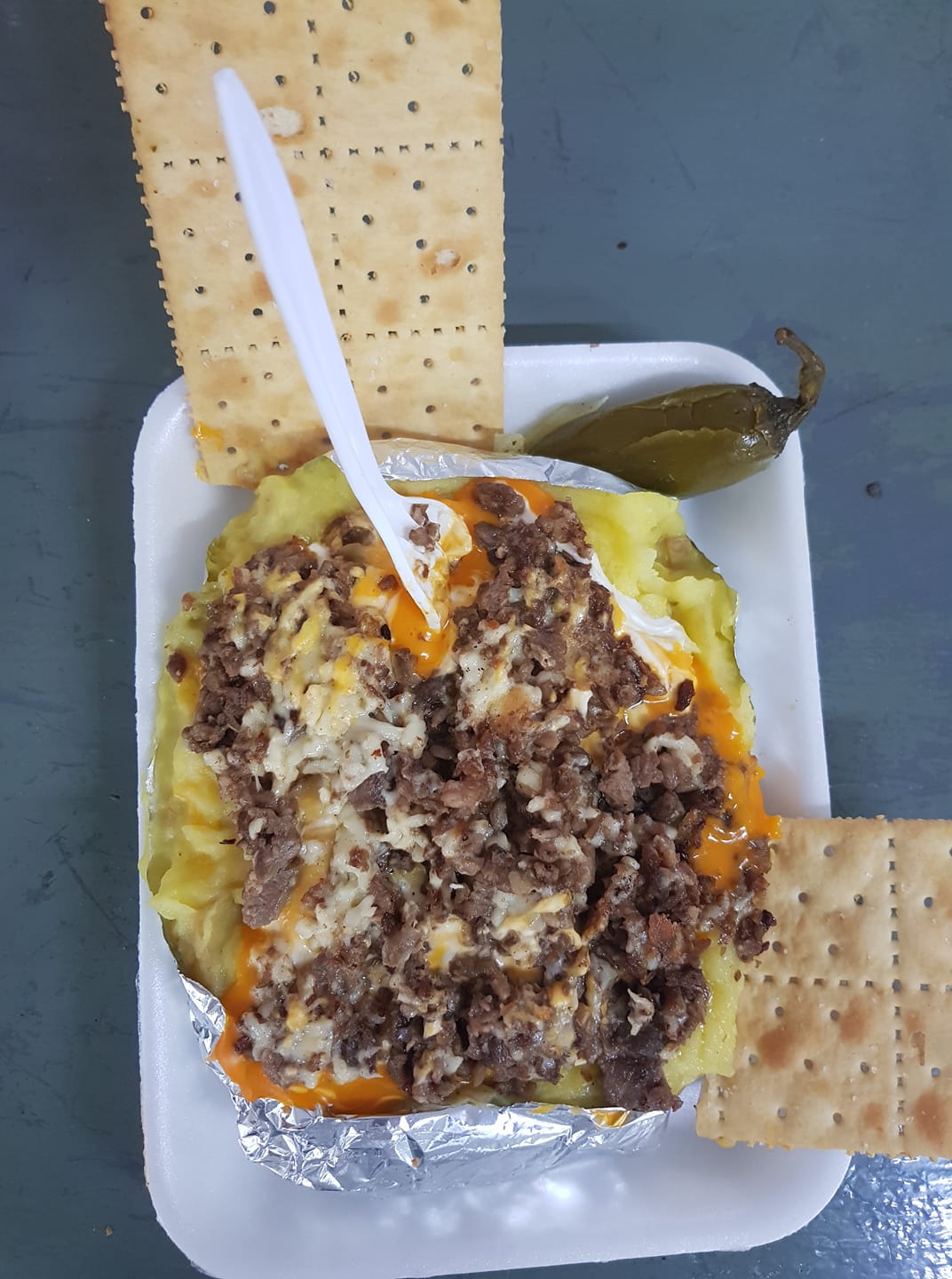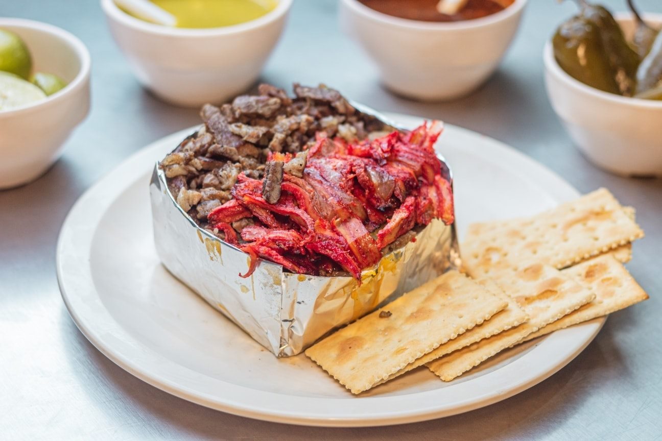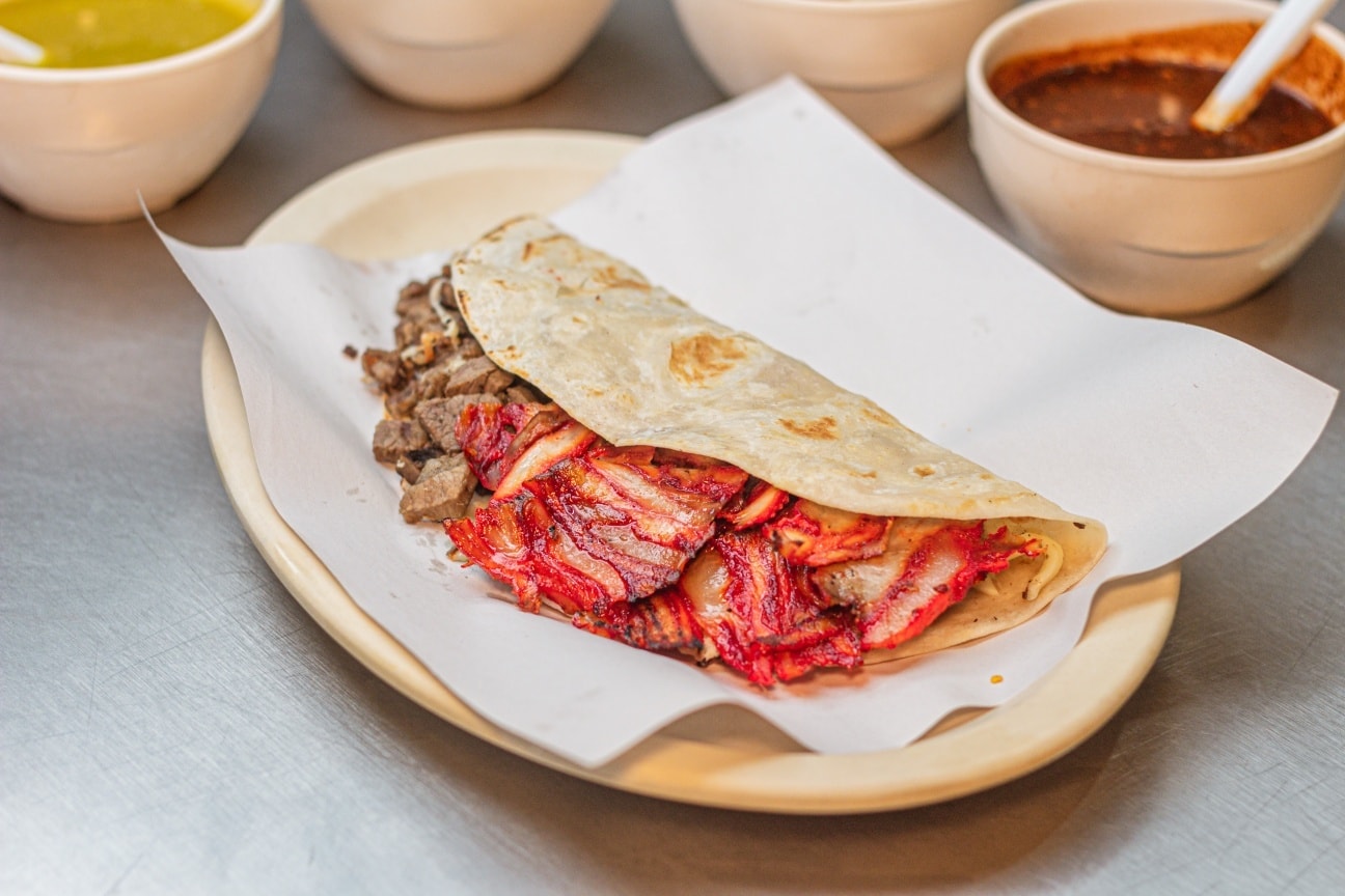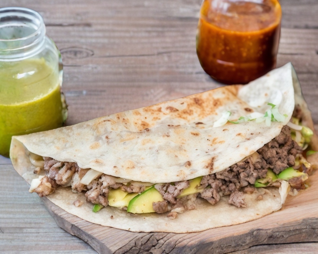 1 tortilla de harina grande (25 cm) con queso, aguacate, cebolla asada, bistec y una porción de papa galeana.