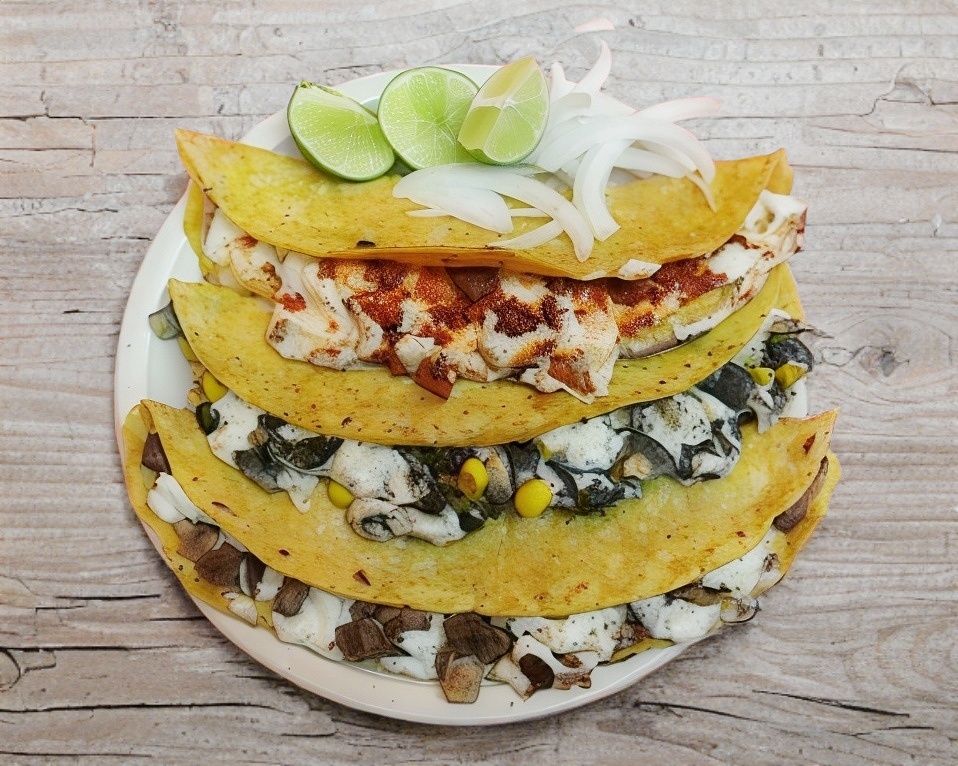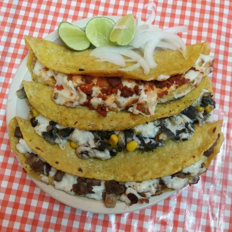 Quesadilla personal de aproximadamente 25 cm elaborada en tortilla de maíz, rellena con tu elección de carnita asada, campechanas, champiñones, nopales, pollo, rajitas u otros, acompañada de tres tortillas de maíz, limón, salsa de la casa y lechuga.