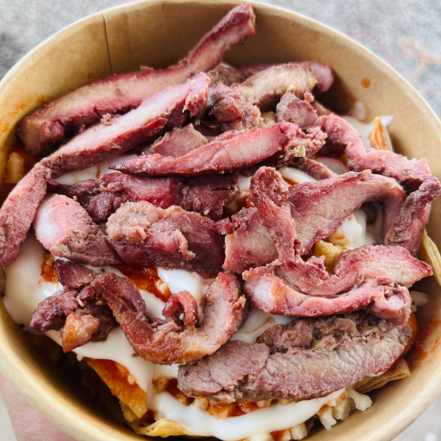 Totopos + salsa + Queso + Crema + Arrachera