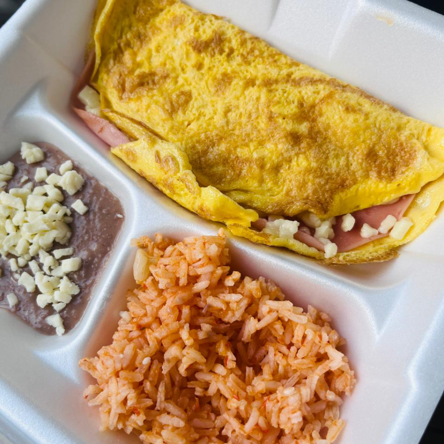 Huevo + jamón + queso + arroz + frijoles y 3 tortillas