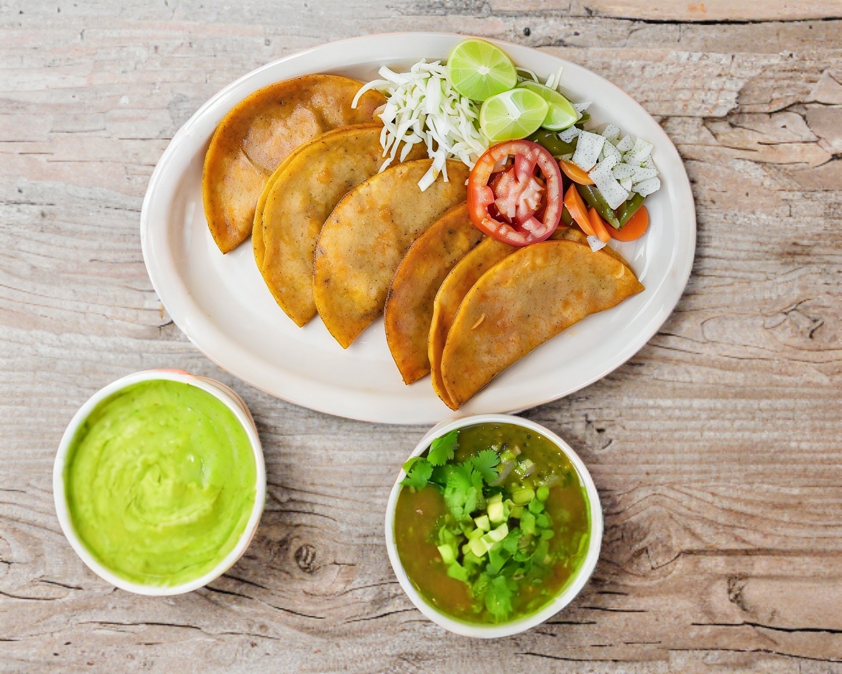 Orden de 5 tacos de guisos surtidos (papa, frijol, deshebrada, chicharrón) acompañado de repollo, salsa verde, salsa roja, cuernitos y limón.
