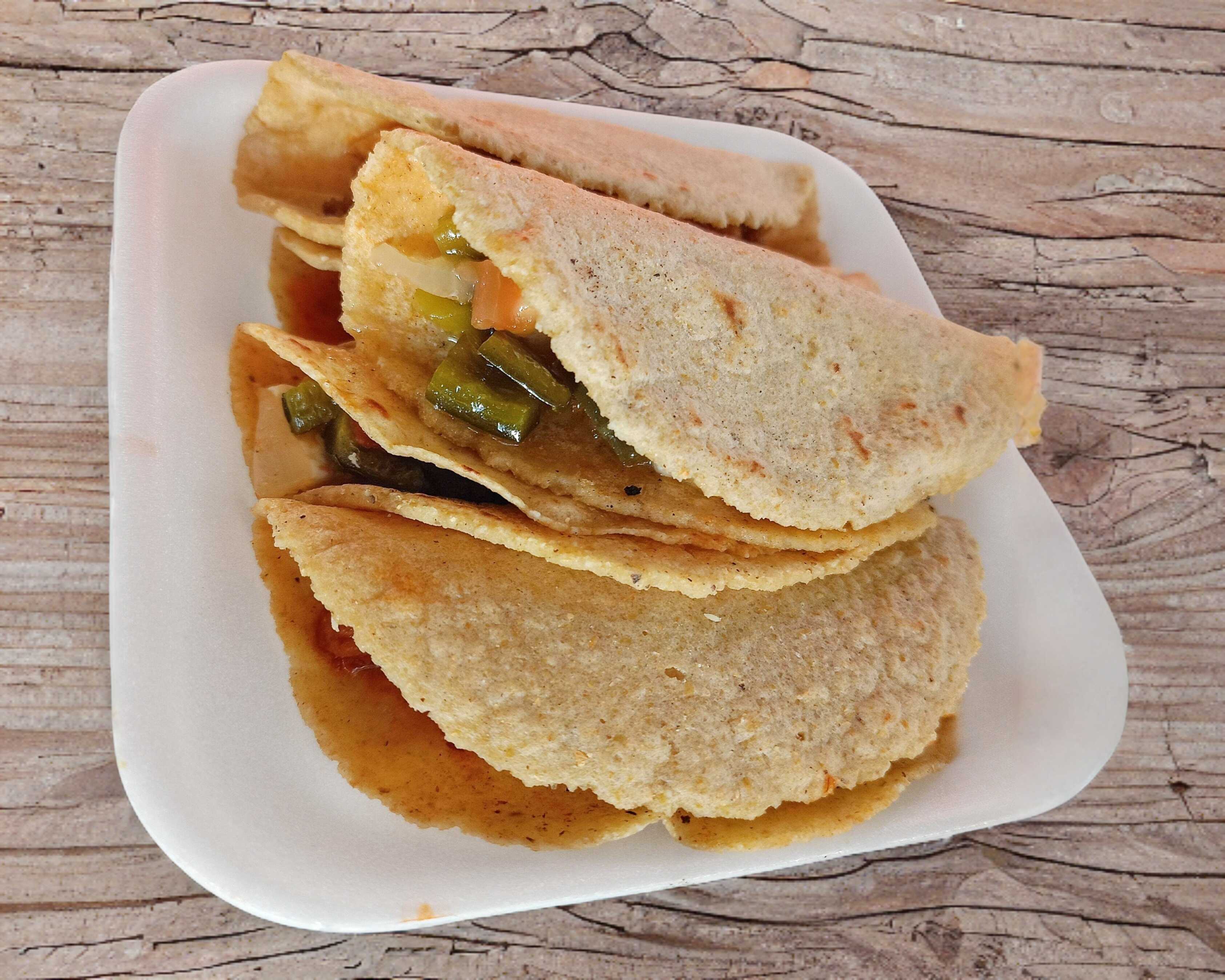 Tortilla recién hecha con guisos mixtos (asado, picadillo, rajas, discada y huevo) incluye: repollo, salsa verde, salsa roja y limón