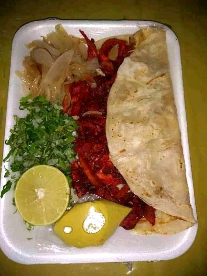 Tortilla de harina con queso asadero,carne de bisteck , cebolla, limón y salsa