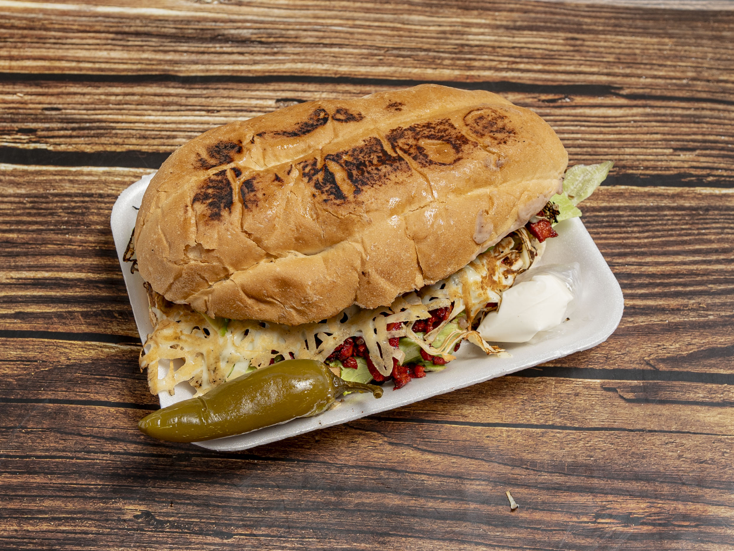 Lechuga, frijoles molidos,carne de trompo, cebolla,tomate, queso fundido, aguacate y jalapeño