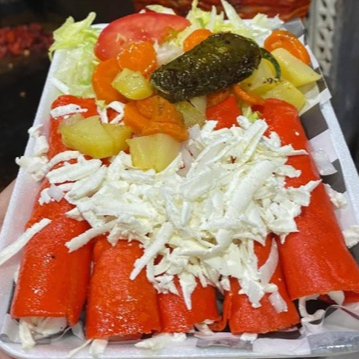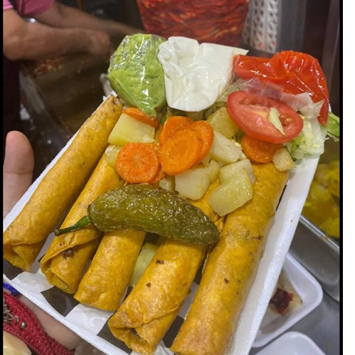 Tortillas de maíz enrolladas con pollo o carne, fritas y bien crujientes.
