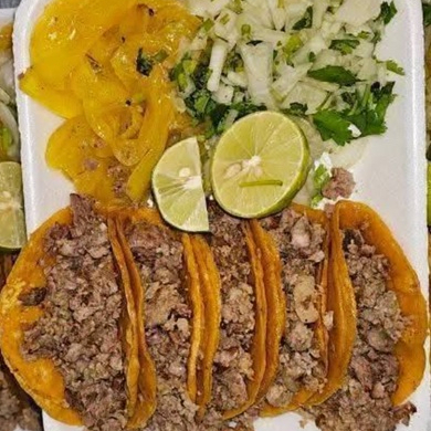 Taco de carne de res picada, servido en tortilla de maíz con cebolla y cilantro.