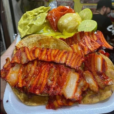 carne de trompo marinado en adobo tradicional, cocinado al pastor.