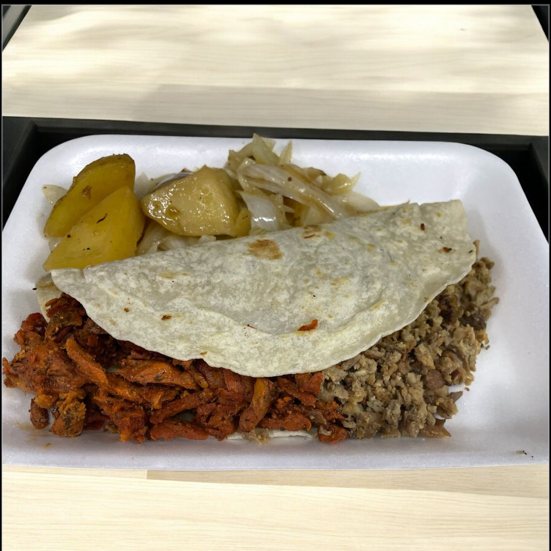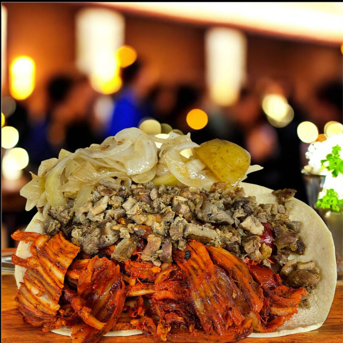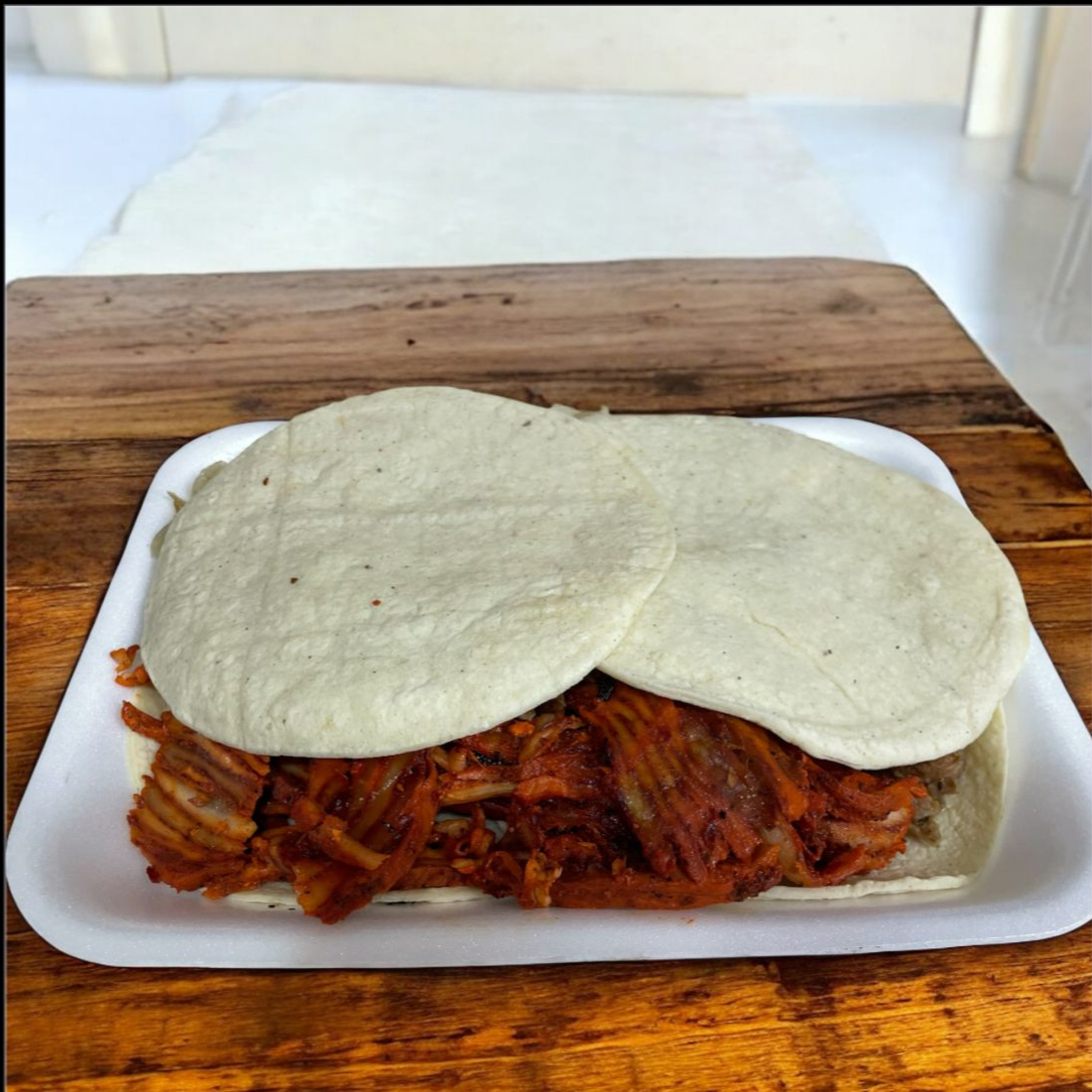 Hecha en tortilla de harina taquera con carne de trompo y bistec incluye cebolla asada y salsas