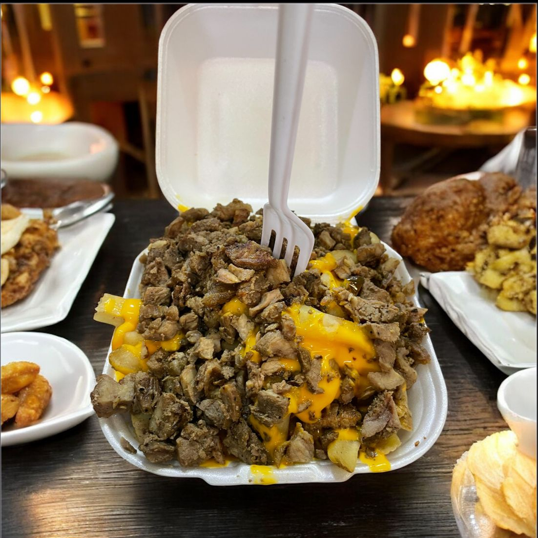 Una porción de papas fritas con queso amarillo y carne de bistec y trompo