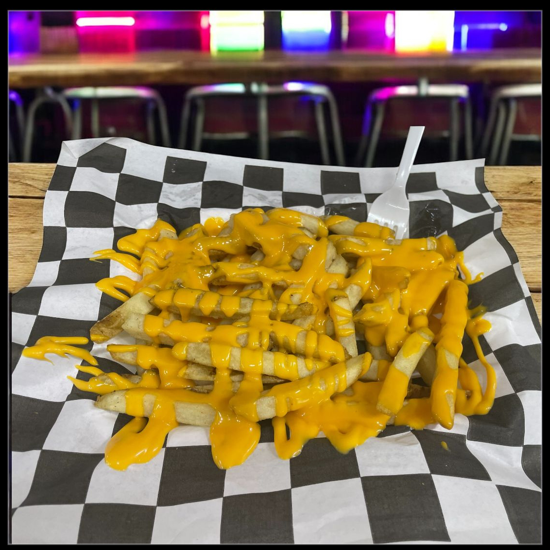 Una porción de papas fritas bañadas con queso amarillo