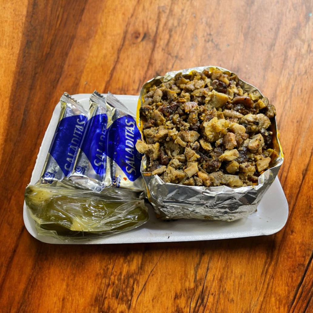 Porción para 4 personas incluye morrón cebolla salchicha de asar carne dé trompo carne dé bistec queso asadero y 12 tortillasde maíz