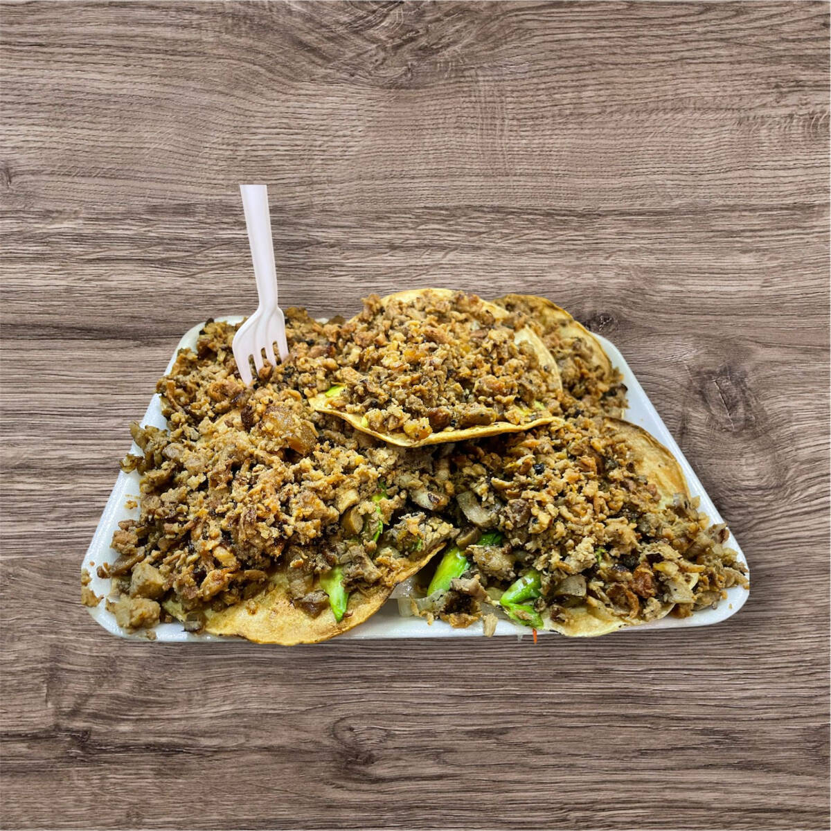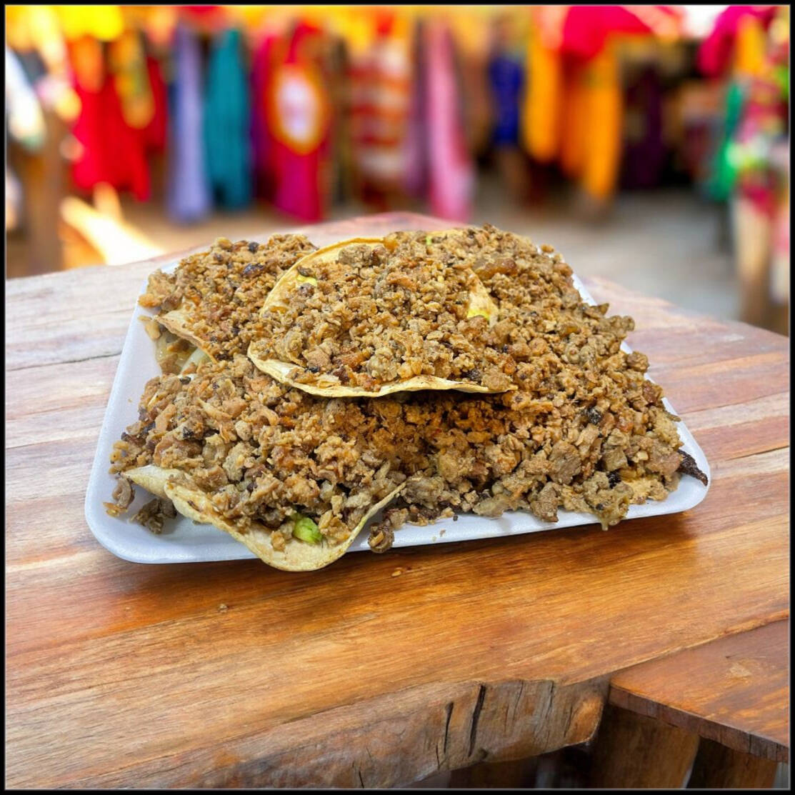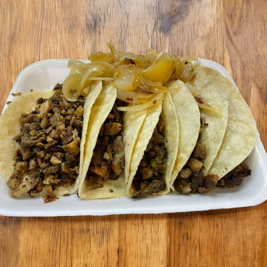 Hecha en tortilla de maíz con carne de trompo y bistec incluye cebolla asada y papa Galeana