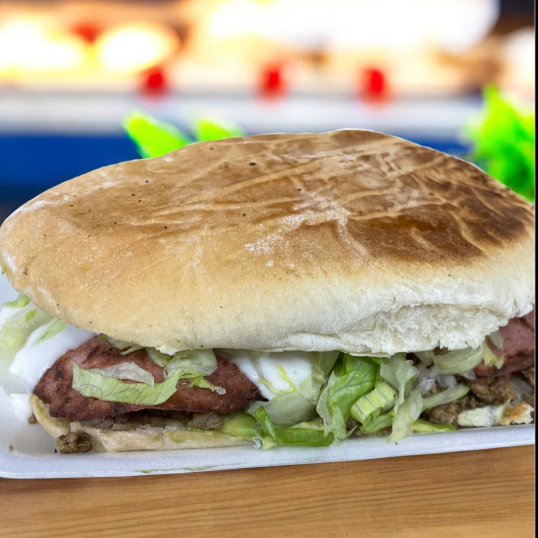 Pan parrillero con carne de hamburguesa casera, carne de bistec y trompo ,jamón , queso amarillo,lechuga y aguacate