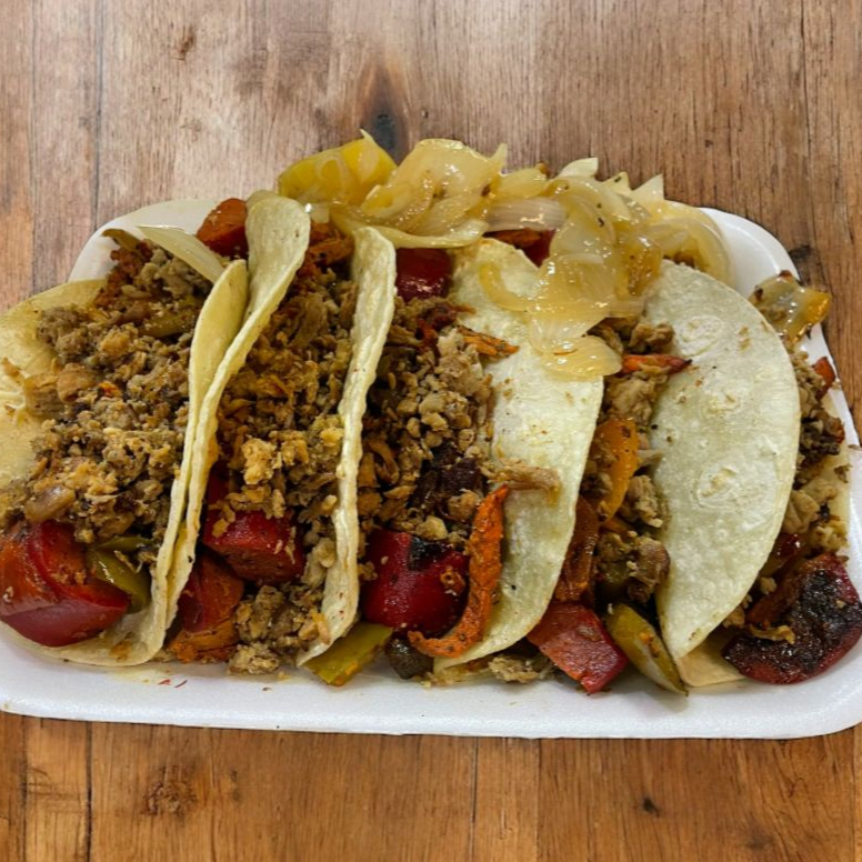 Orden de 5 piezas en tortilla de maíz, incluye cebolla asada y salsas