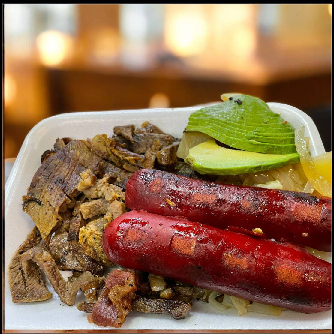 1 porción de 200 gramos de carne asada acompañado de una salchicha con tocino y queso , incluye cebolla asada y aguacate con 5 tortillas de maíz