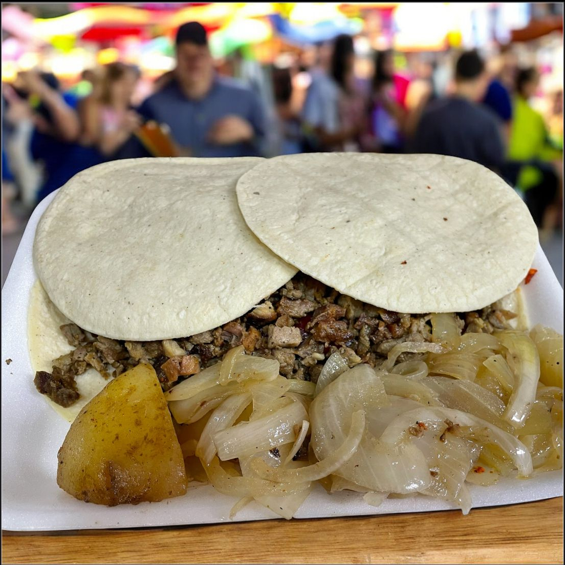 Hecha en tortilla de harina chica con carne de bistec incluye cebolla asada y papa Galeana