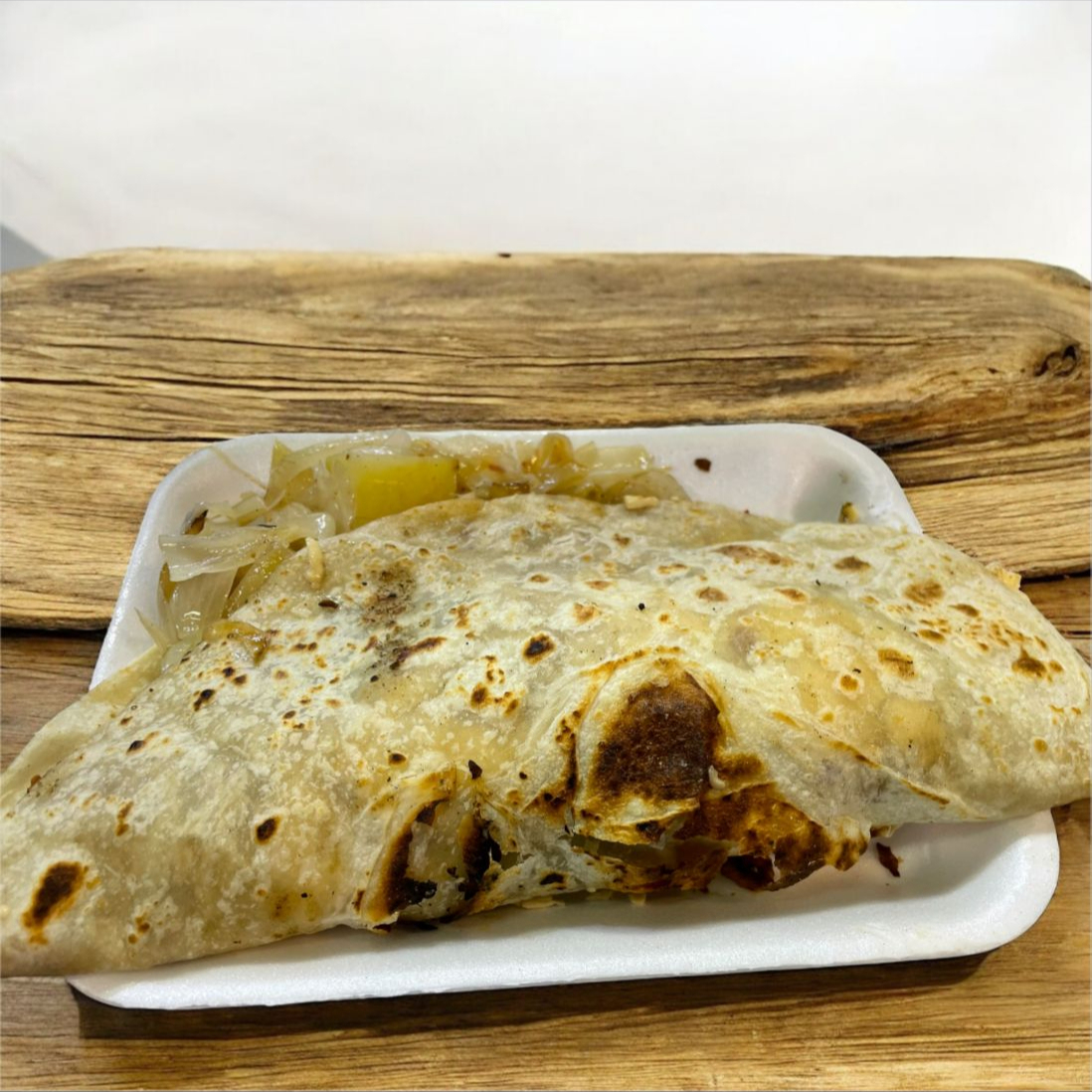 Hecha en tortilla de harina jumbo con carne de trompo incluye cebolla asada y papa Galeana, salsas