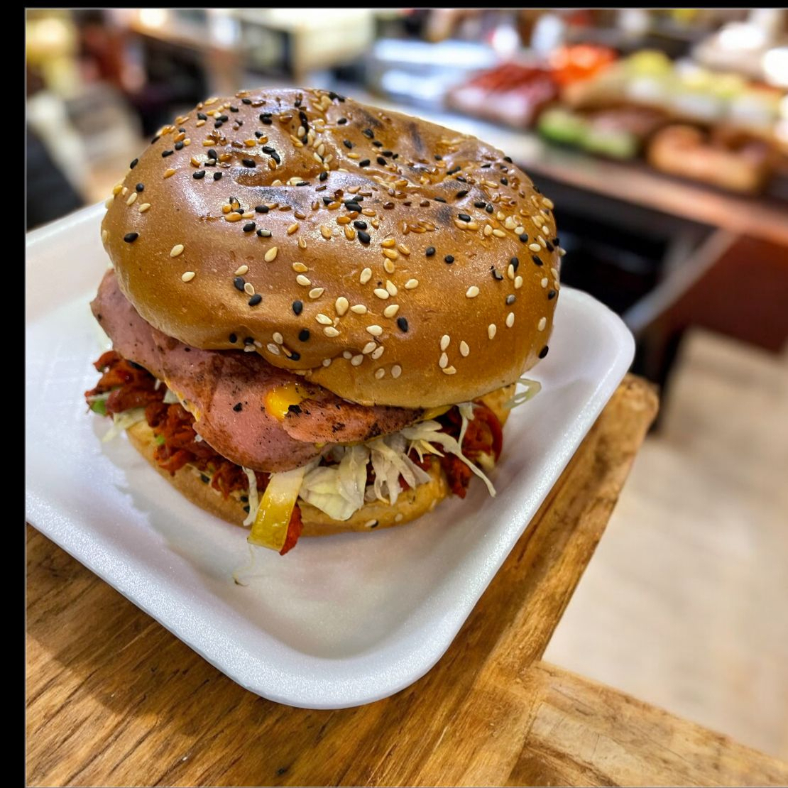 Pan parrillero con carne de hamburguesa casera, jamón y queso amarillo, lechuga, aguacate y jitomate