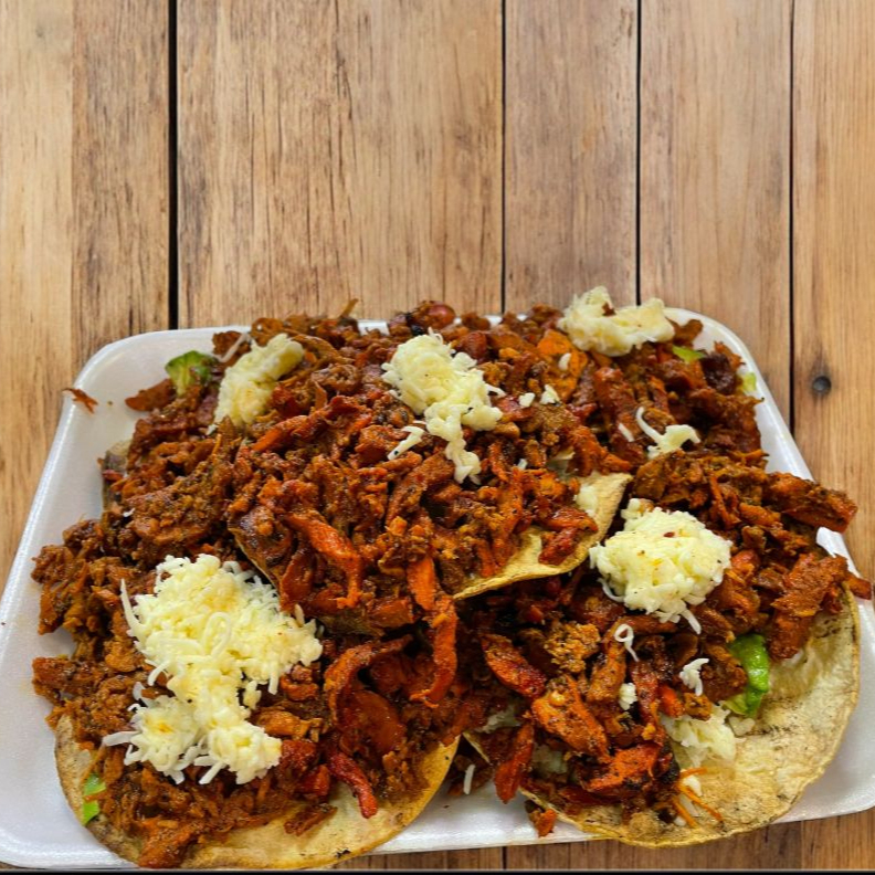 Tostadas con queso asadero y aguacate con carne de bistec y trompo incluye cebolla asada