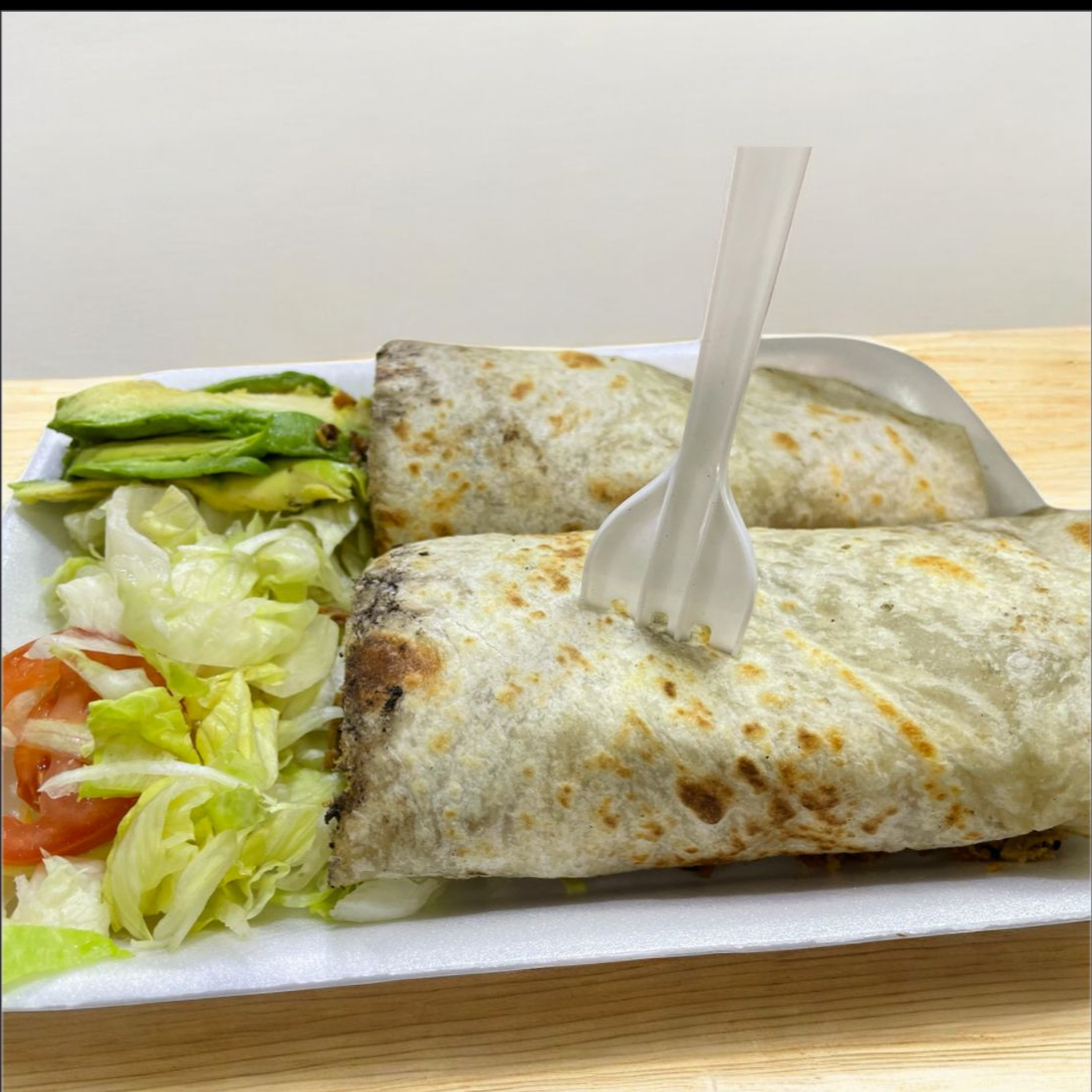 Hecha en tortilla de harina jumbo con carne de trompo, frijol refrito ,incluye lechuga , aguacate y jitomate