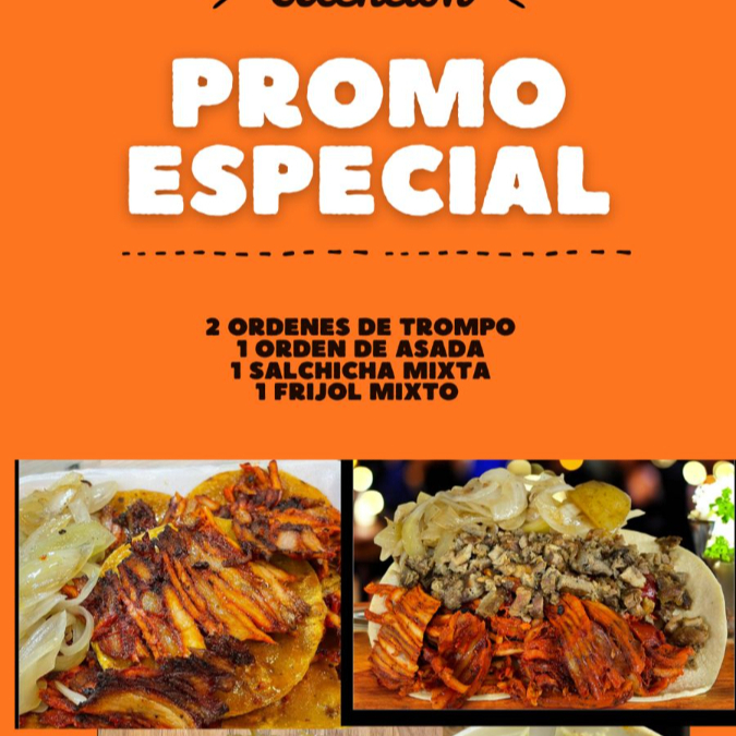 2 ordenes de trompo, 1 orden de asada, 1 salchicha mixta, 1 frijol preparado