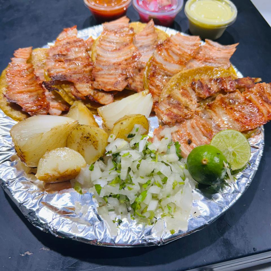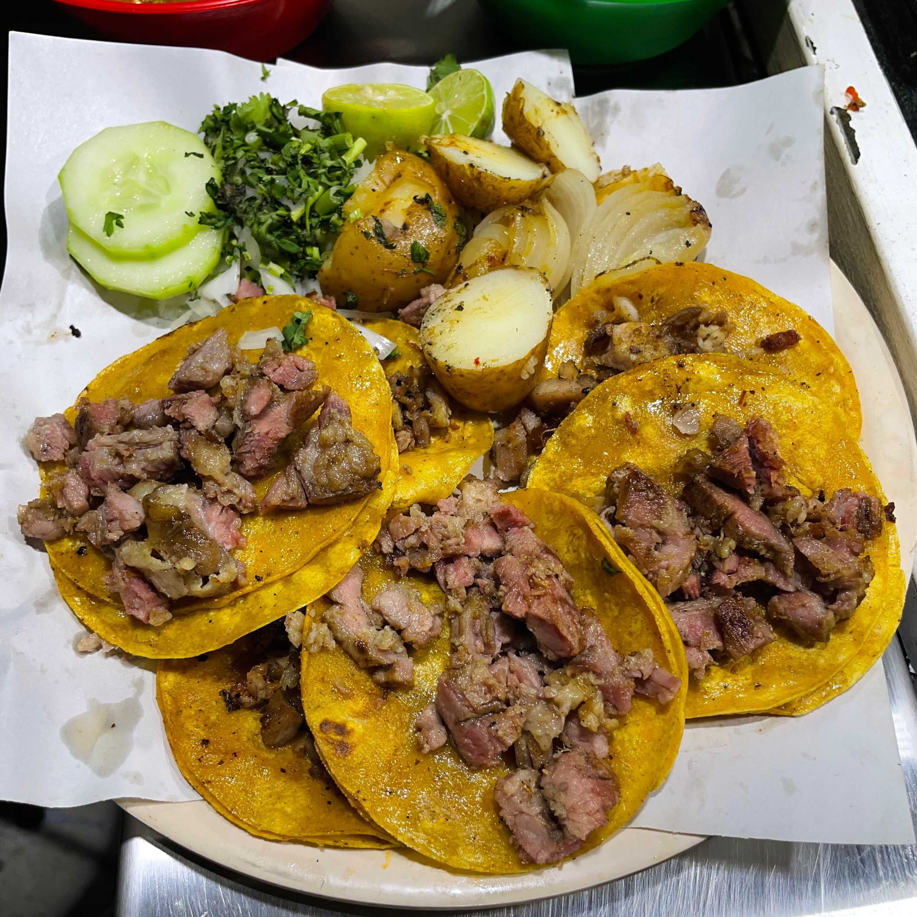 5 tacos con doble tortilla incluye cebolla, cilantro, limon, cebolla cocida y papa galeana