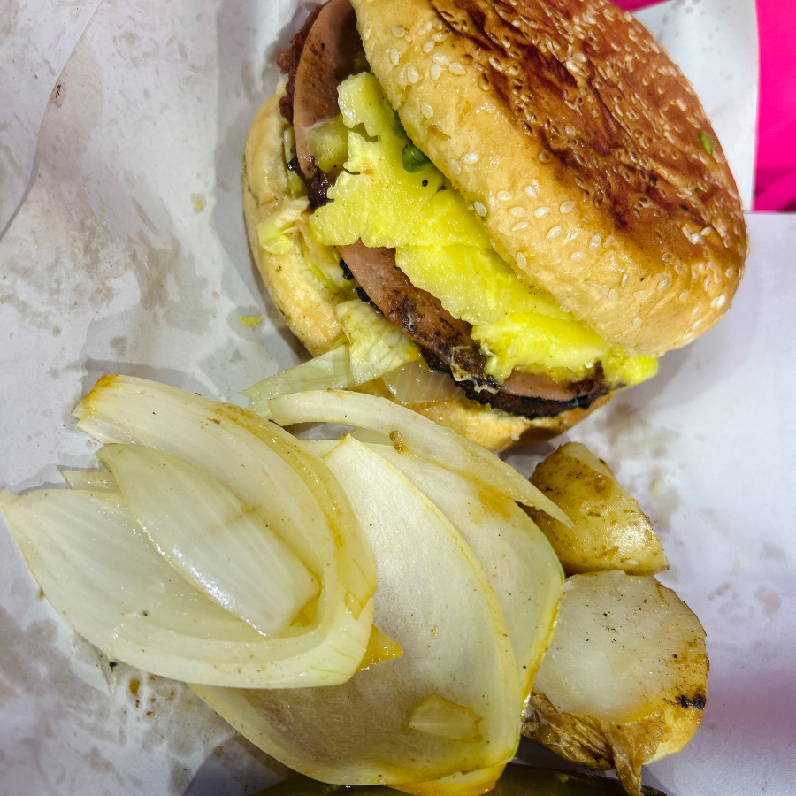 Hamburguesa con doble carne de res, una salchicha,carne de trompo, piña, aguacate, cebolla, tomate, jamon, lechuga, queso americano, catsup, mayoneso y queso amarillo