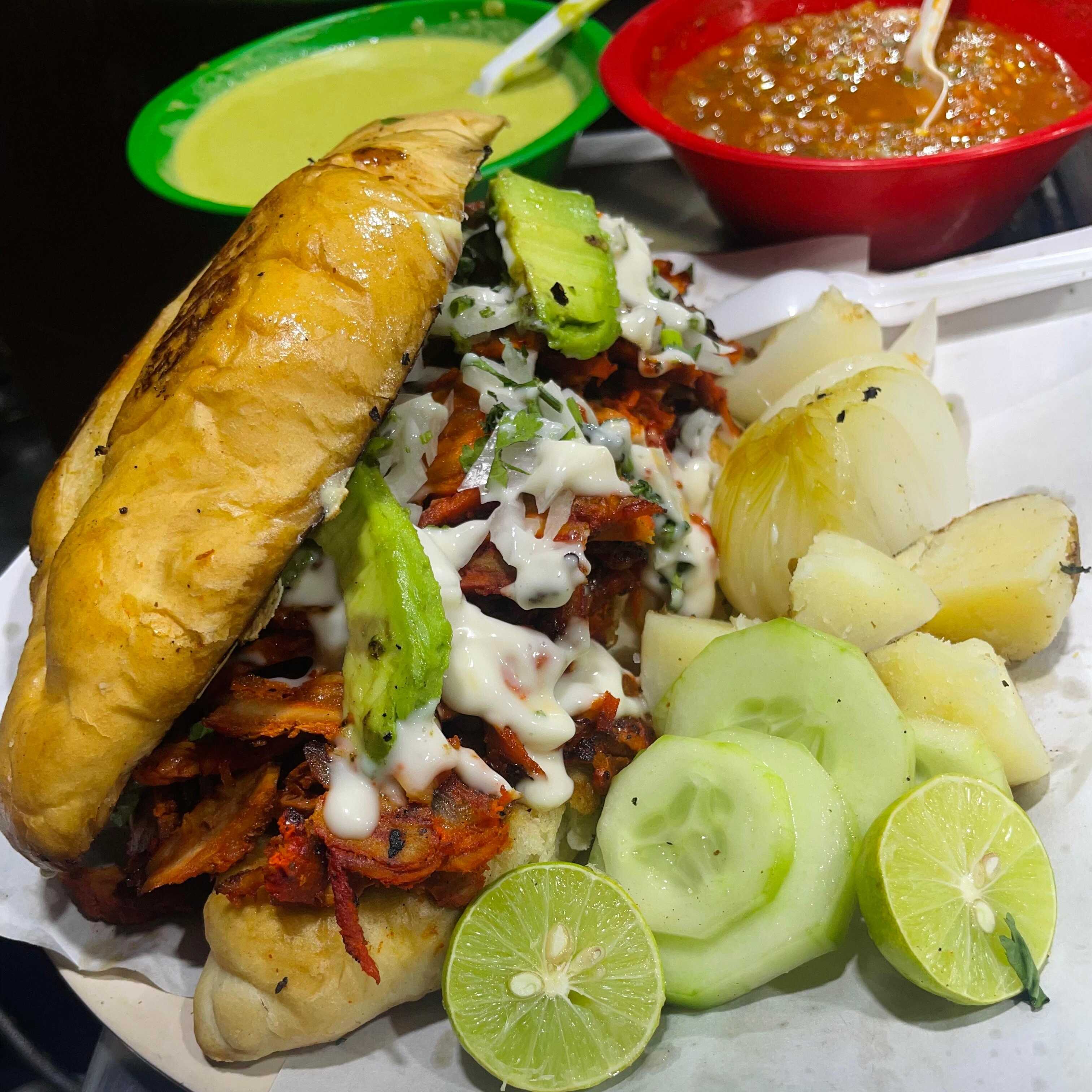 pan grande, incluye costra de queso, mayonesa, aguacate, cebolla, cilantro, pepino, papa galeana y cebolla cocida