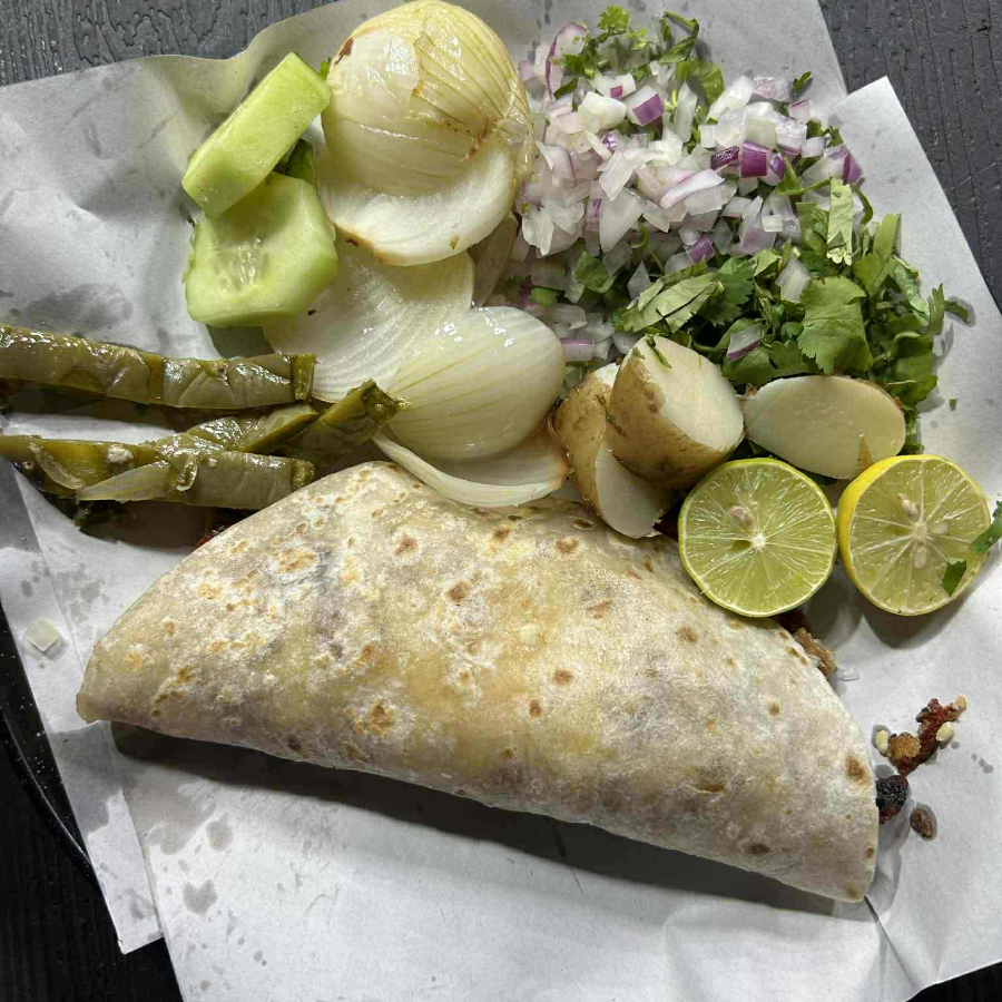 Tortilla de harina tamaño grande con carne mixta y queso incluye cebolla, cilantro, pepino, cebolla cosida y papa galeana