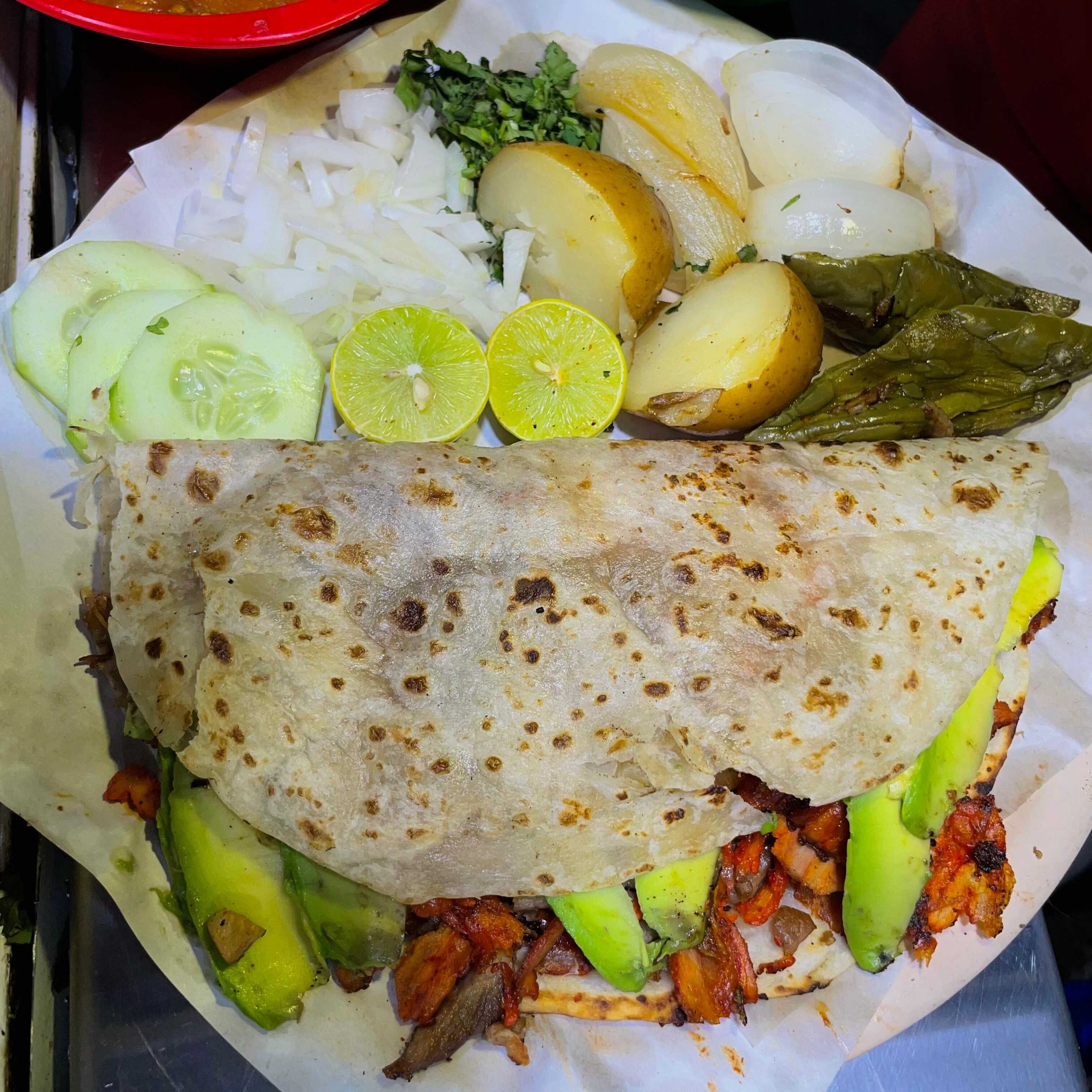 tortilla de harina de 28 cm, queso, carne de trompo, aguacate, incluye, cebolla, cilantro, papa galeana y cebolla cosida