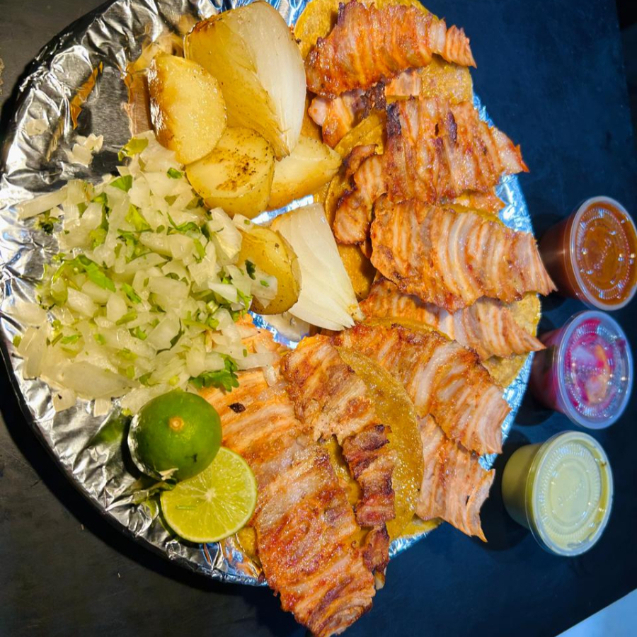 5 tacos doble tortilla (bistec de puerco) incluye cebolla, cilantro, papa galeana y cebolla cocida