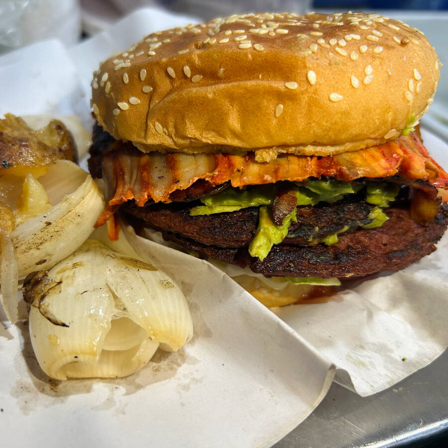 1 hamburguesa con doble carne de res, carne de trompo, pan, jamón, queso americano , lechuga, cebolla, tomate, aguacate, catsup, mayonesa y queso amarillo