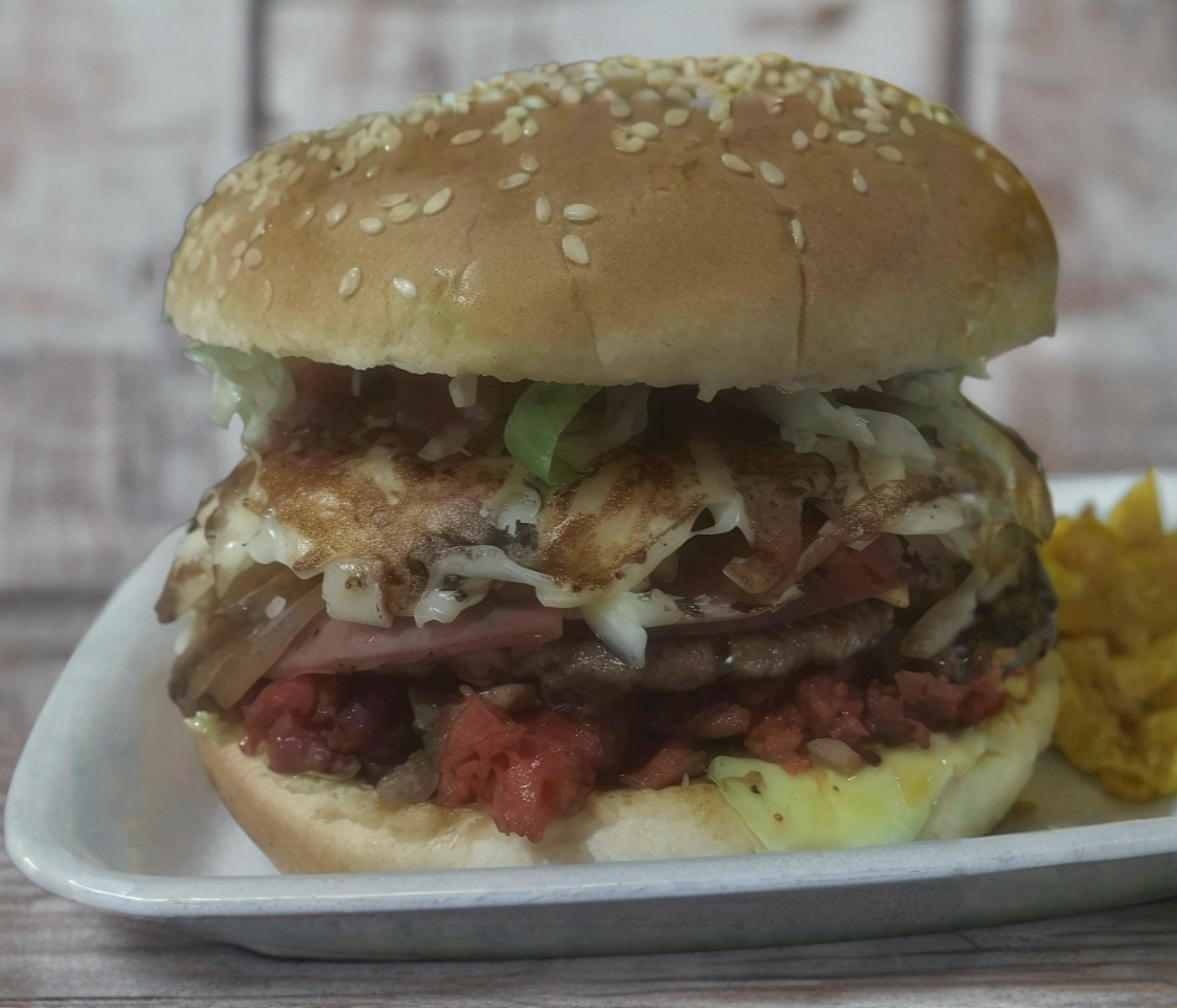 Nuestro delicioso carne casera 2 carne jamón salami lechuga tomate aguacate y aderezo.