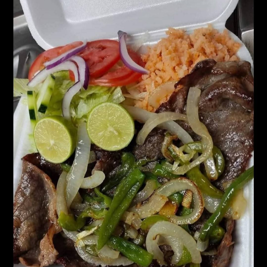 250 Fajitas de res con jalapeño cebolla acompañado con lechuga tomate aguacate con porción de papas fritas